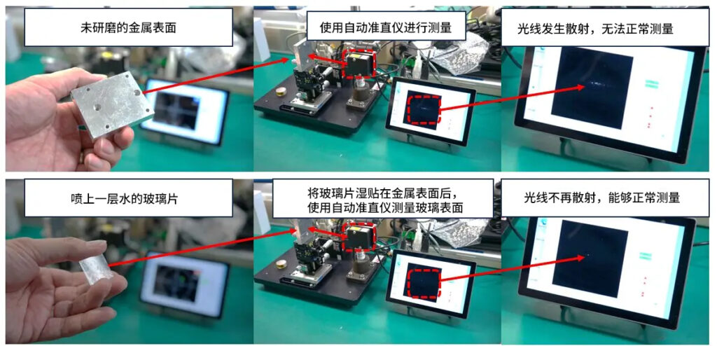 通常情况下,未研磨的金属表面会对激光产生强烈散射,因此难以使用激光自准直仪进行精确测量。然而,通过在金属表面贴附一片薄而轻的盖玻片,并在其中一面喷涂水或油等液体,使其“湿贴”在金属表面,即可形成光学上平坦的测量面。