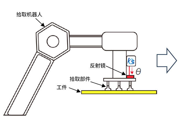 在拾取部件的基座上安装反射镜,并使用倾斜度传感器持续监测角度变化。通过角度变化即可判断易损部件的更换时机,从而实现降低维护成本的目的。